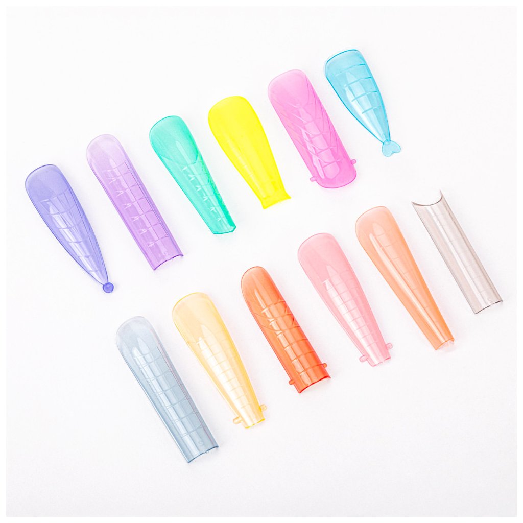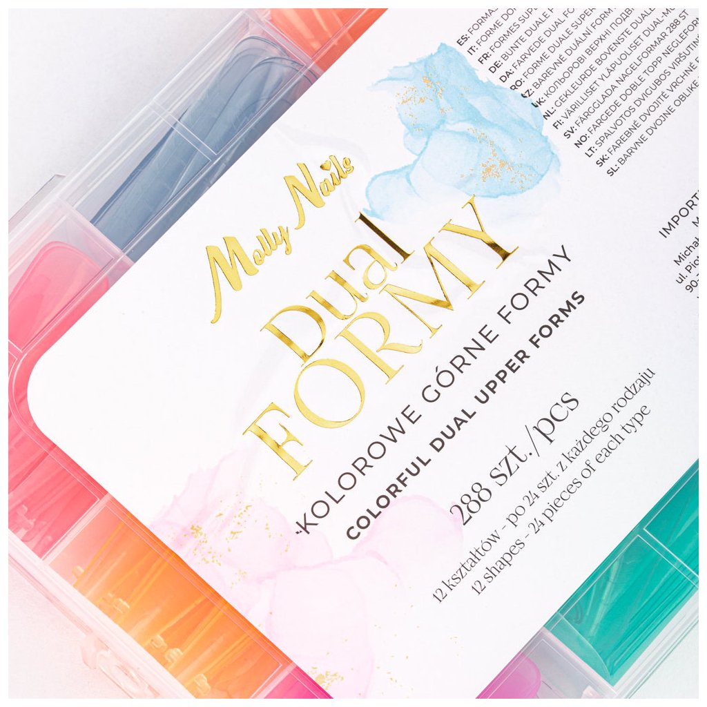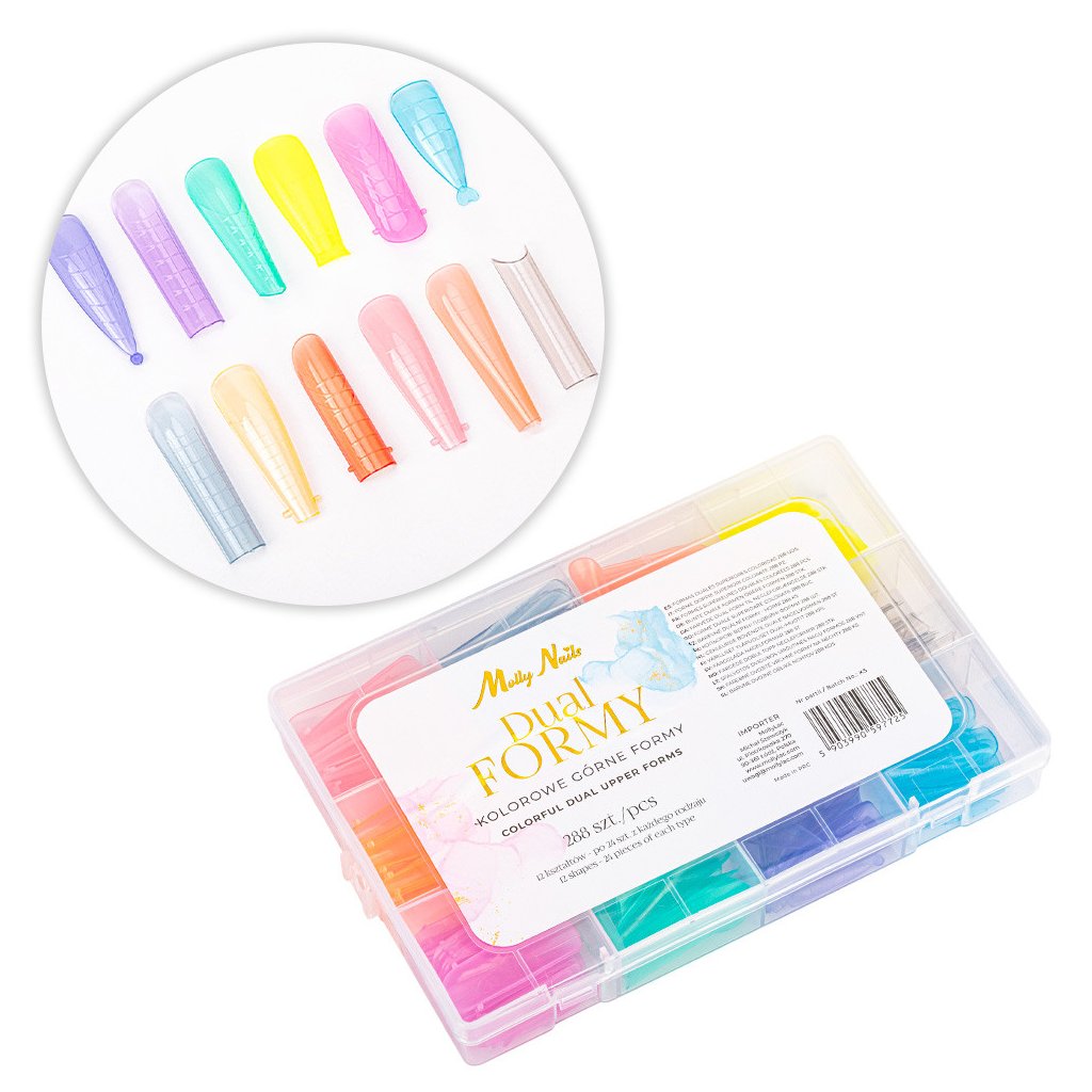 Barevné DUAL formy pro rychlé a přesné prodloužení nehtů gelem nebo akrygelem - 12 tvarů, 288 kusů. Pohodlné přizpůsobení a opakované použití.